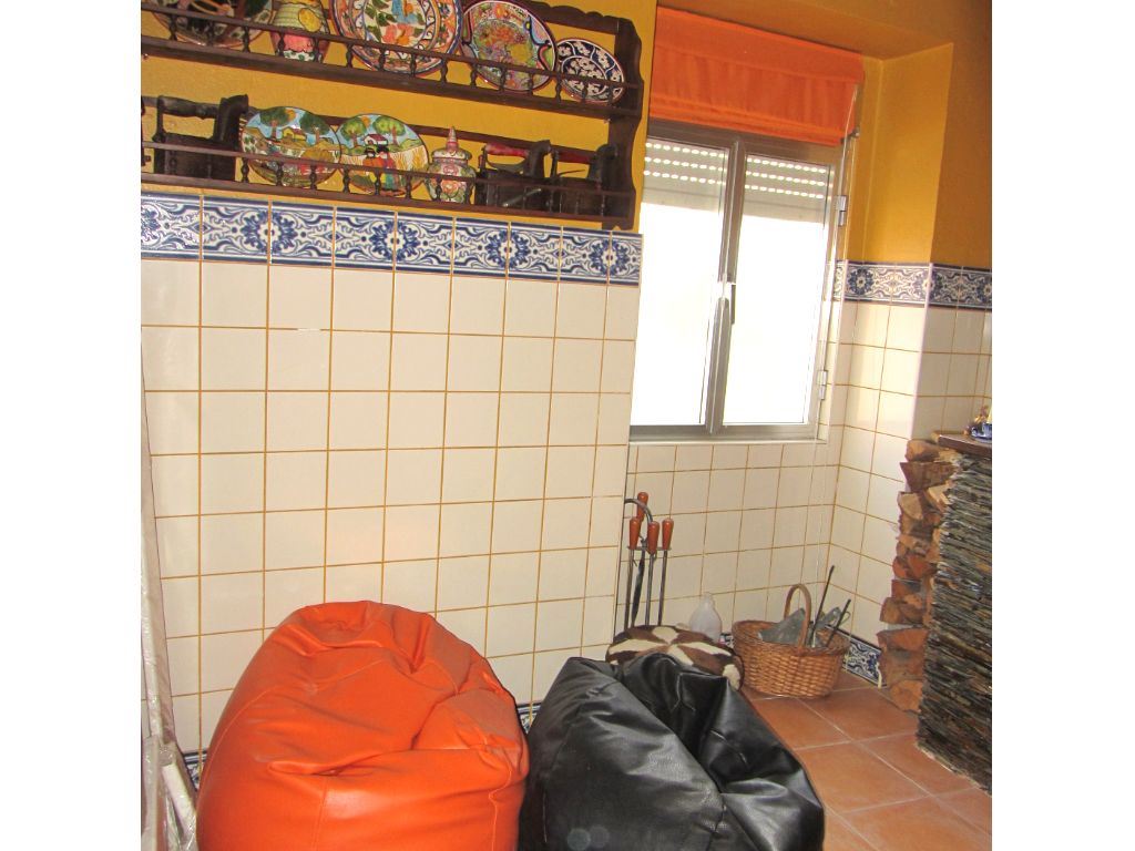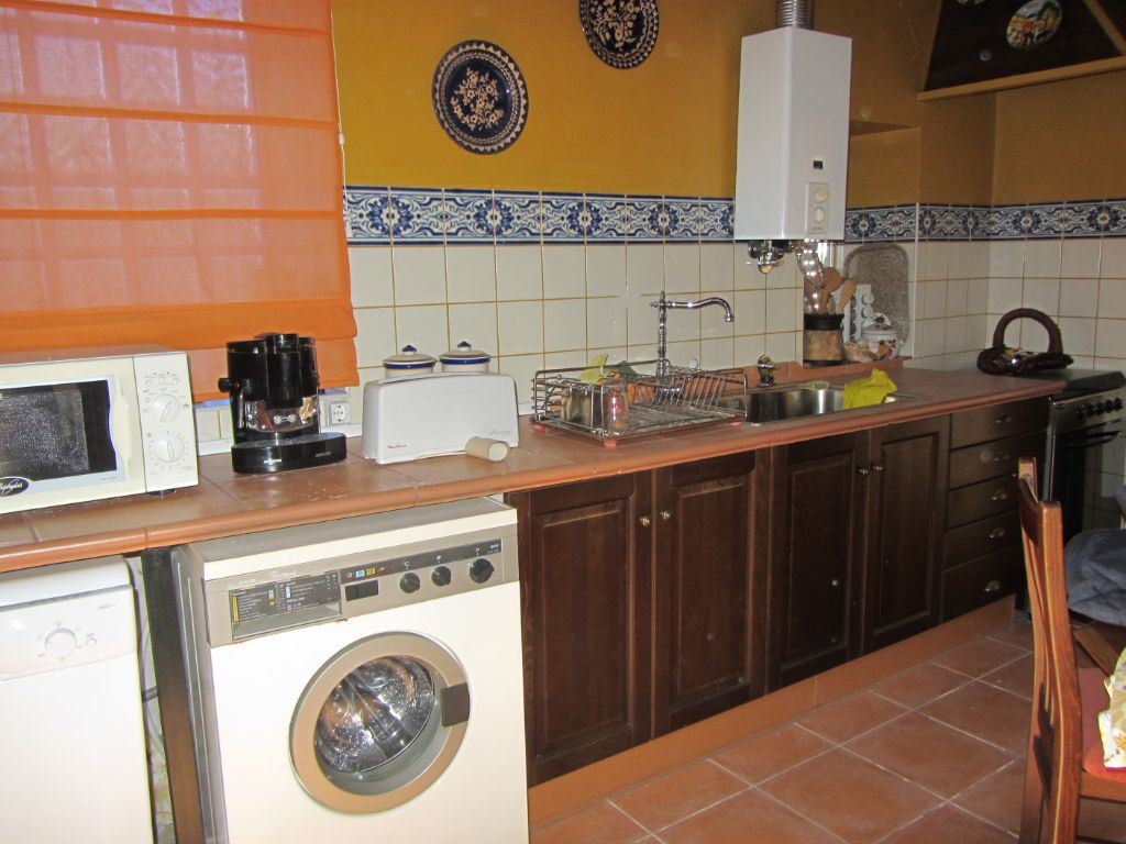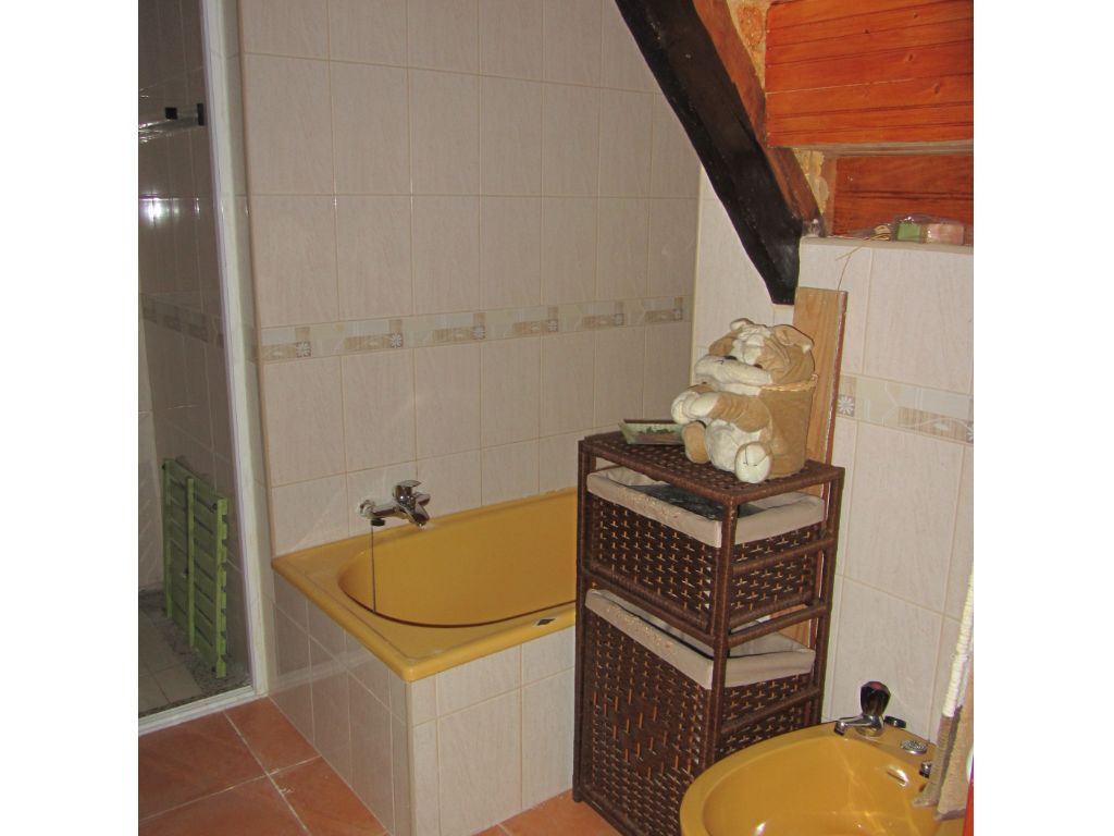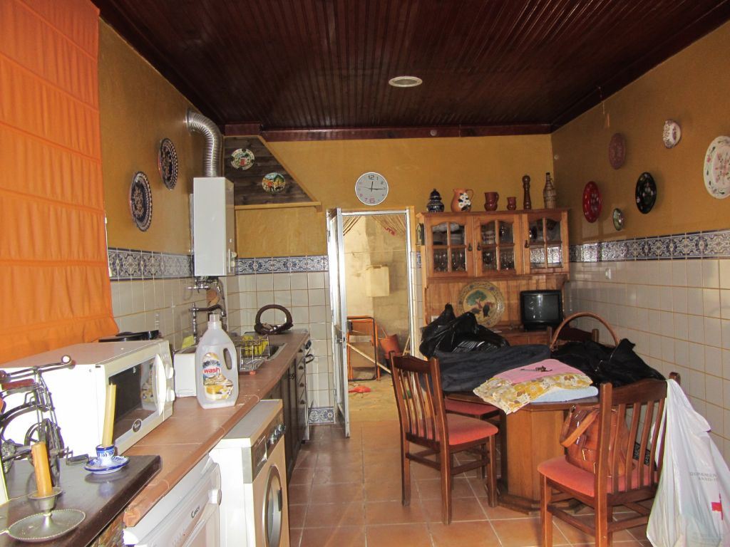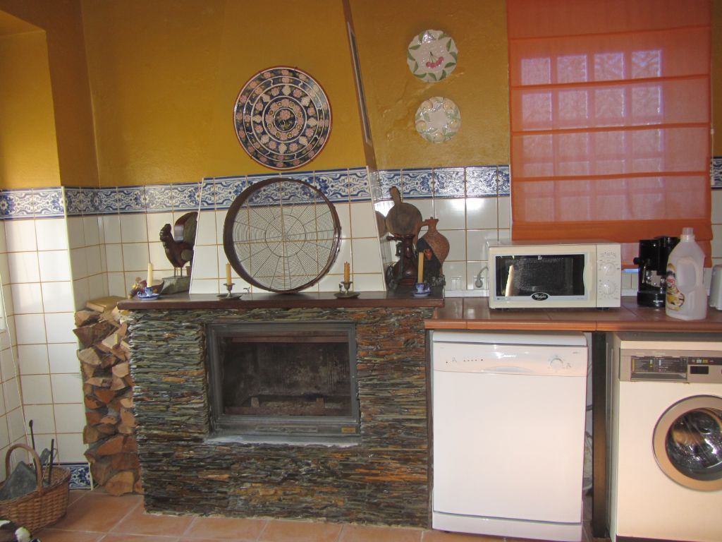 No R/C tem uma cozinha espaçosa, com lareira e zona de refeições e uma casa de banho completa.